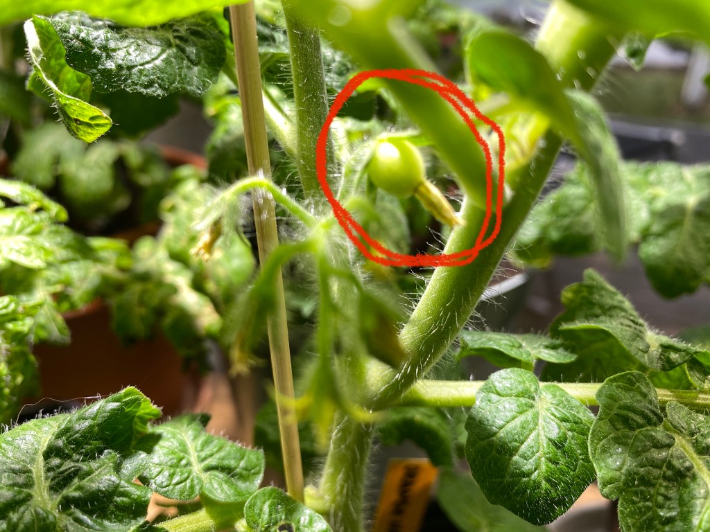 Och äntligen har en liten tomat visat sig på en av microdwarfarna. Många blommor på plantorna verkar ramla av utan att bilda tomater. Attans! Får skaka på dem lite oftare. Om det nu är så att de inte pollineras…