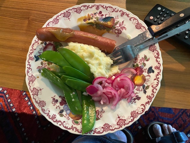 Men varför sluta när det som roligast! Dagens middag står hon för: Wienerkorv från Attanäs, picklad rödlök, hemgjord ketchup, sockerärtor och inte minst handmosad potatismos på helmjölk från Solmarka gård (absoslut inte massakrerad i mixern!).