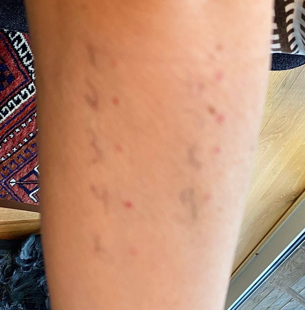 Nu testar de bara 7 grejer, två av prickarna är till för att kolla om testet är korrekt eller inte. Ska göra om en gång till nästa vecka eftersom jag hade tagit antihistaminer typ var dag senaste veckan, och det kan ha påverkat utslaget. Får helt enkelt försöka uthärda klådan i fem dagar och inte ta någon lergigan på kvällen fram till dess!