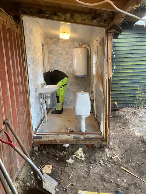 Han: Idag för ett år sedan började vi att bygga i Chateau Margareta. Vi och vi som kungen brukar säga, Pluralis majestatis, det vill säga mest Engmans pojkar Tomek och Krzysztof som förvandlade en liten toa med bidé, ett utedass under tak och en vedbod till ett badrum.