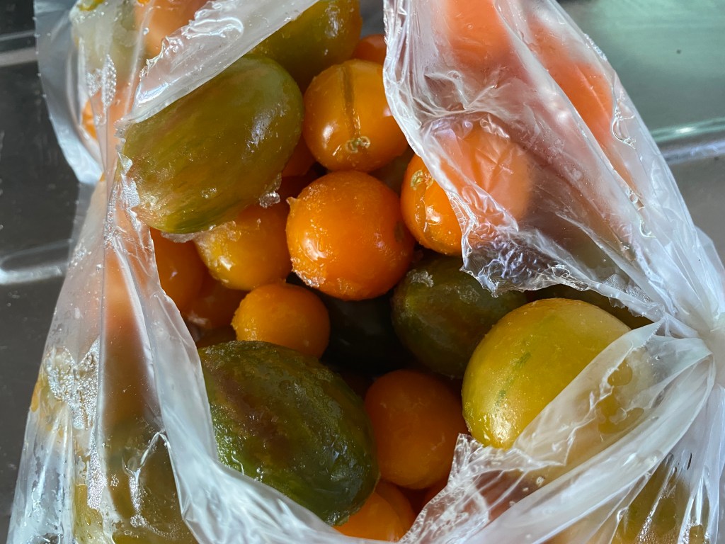 Ibland blir det lite gröna blad på mackorna (från pallkragarna utomhus), men bara om det är milt, vid minusgrader blir de sladdriga och oplockbara. Lite infrusen paprika från förra årets skörd kan det också bli. Och någon köpt trist tomat. Detta är alltså till frukost, sen äter vi i princip inte mer grönt.