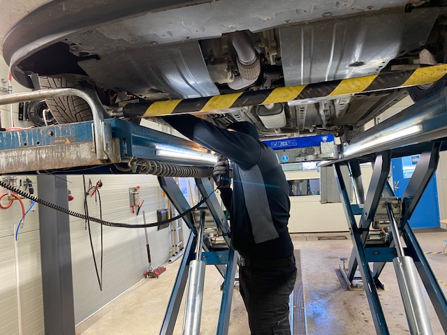 Och så händer det. Jag ska åka och besikta bilen, en av de saker vi män gör och jag är lite sen. Det är hennes tur att städa och naturligtvis hon får hon för sig att vi absolut måste vända på matten under matbordet och även om jag egentligen inte har tid hjälper jag henne.