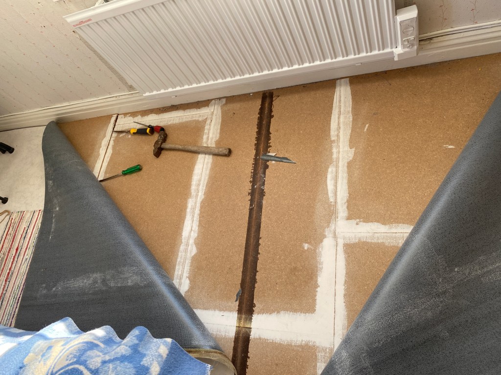 Och äntligen har vi konstaterat att plastmattorna och masonitskivorna som ligger på golven i torpet är lätta att få bort. Inte massa nubb eller klister.