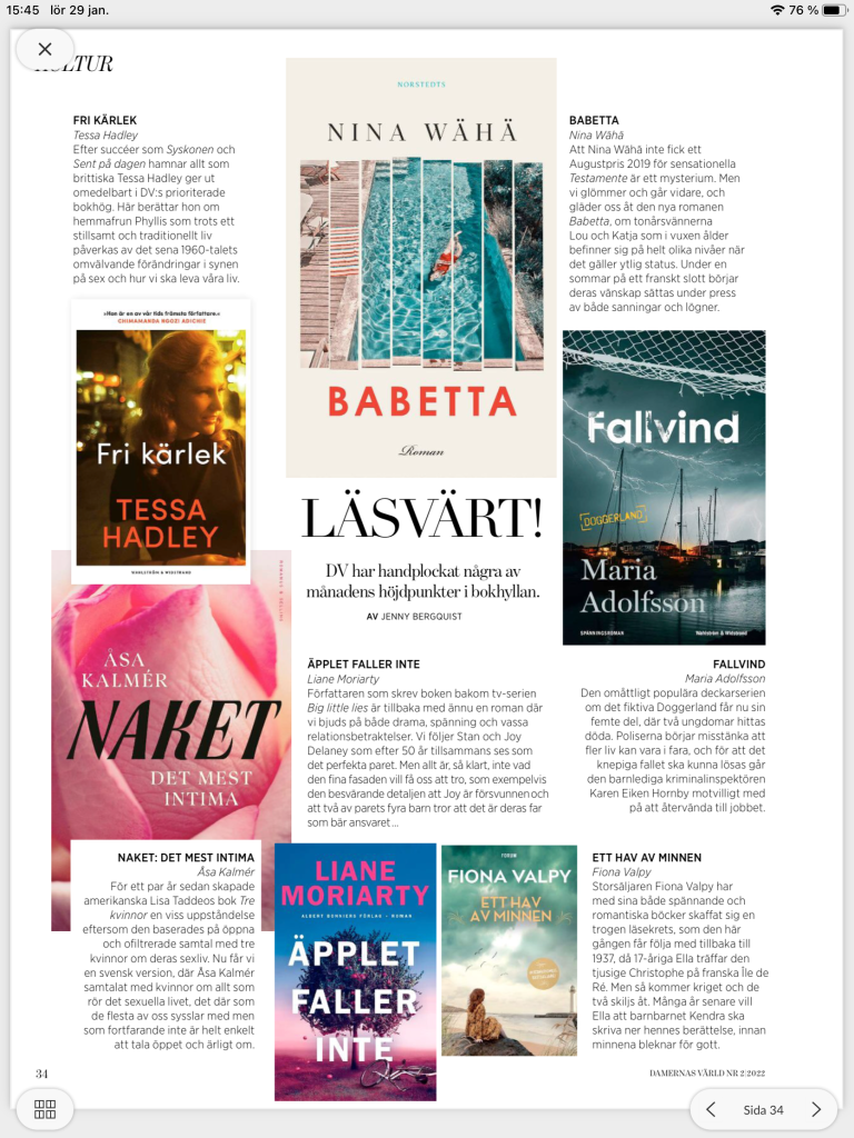 Hon: Och jag ligger på soffan och läser magasin på ARCY och Readly. Tar lite skärmdumpar på intressanta tips jag vill komma ihåg. Den ovan var på boktips i senaste Damernas. Flera jag blev sugen på att läsa!
