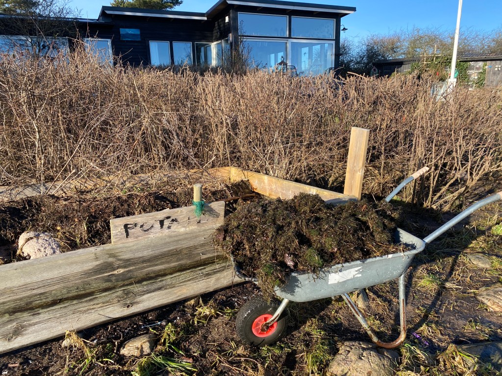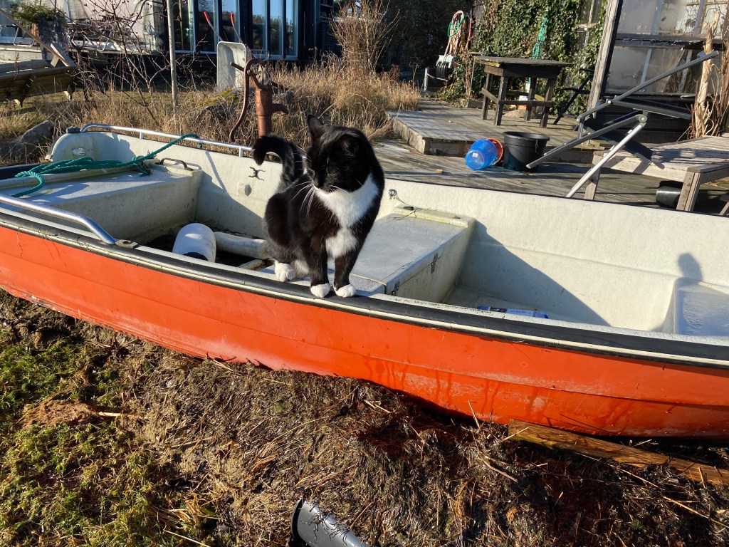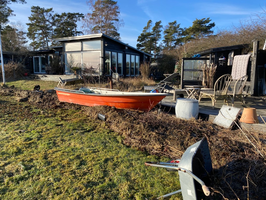 Båten ligger inte bara vid altanen, den ligger högt på en bädd av sjötång blandat med krukor och annat krafs dessutom! Och var gör jag av all tång. Landen fyllde jag efter förra högvattnet.
