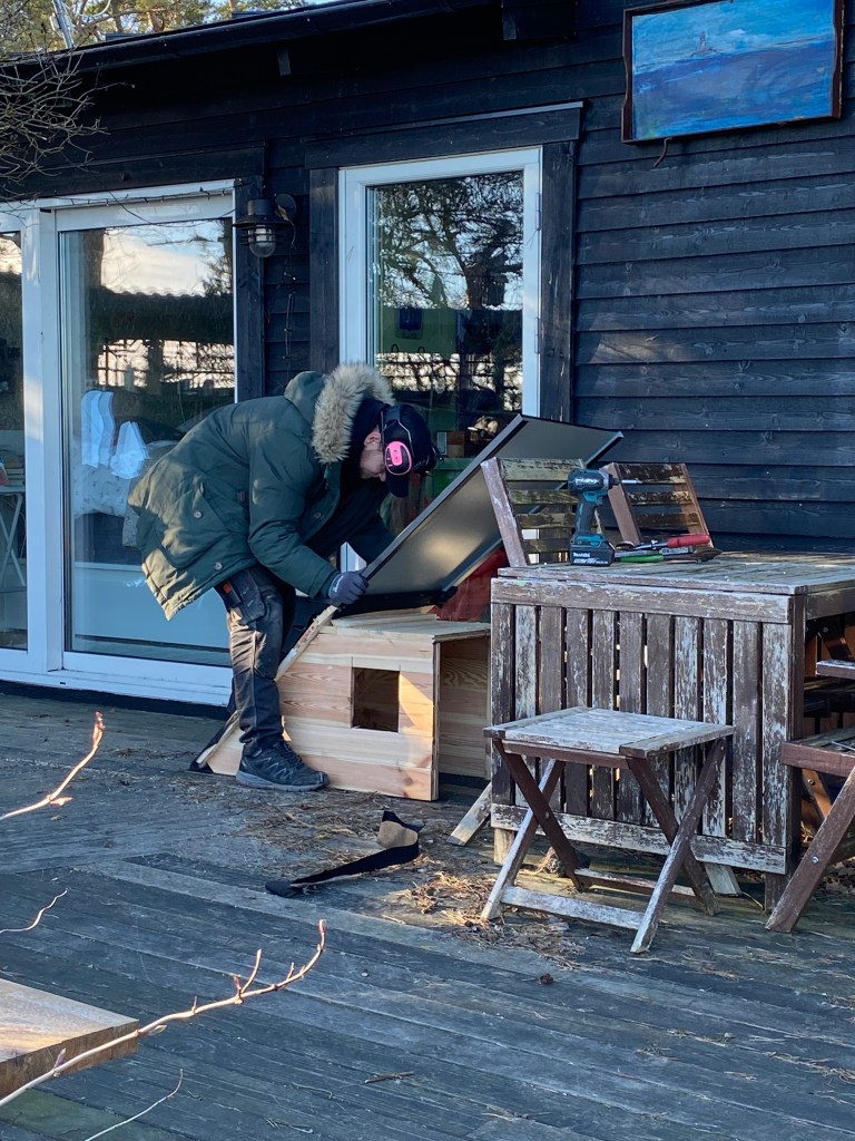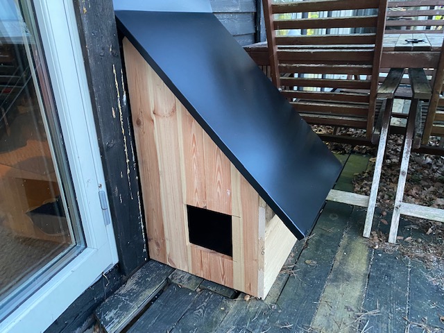 Och så kom Hago plåt med ståndsmässigt, nytt tak till kissarnas entré. Det missade husse också…