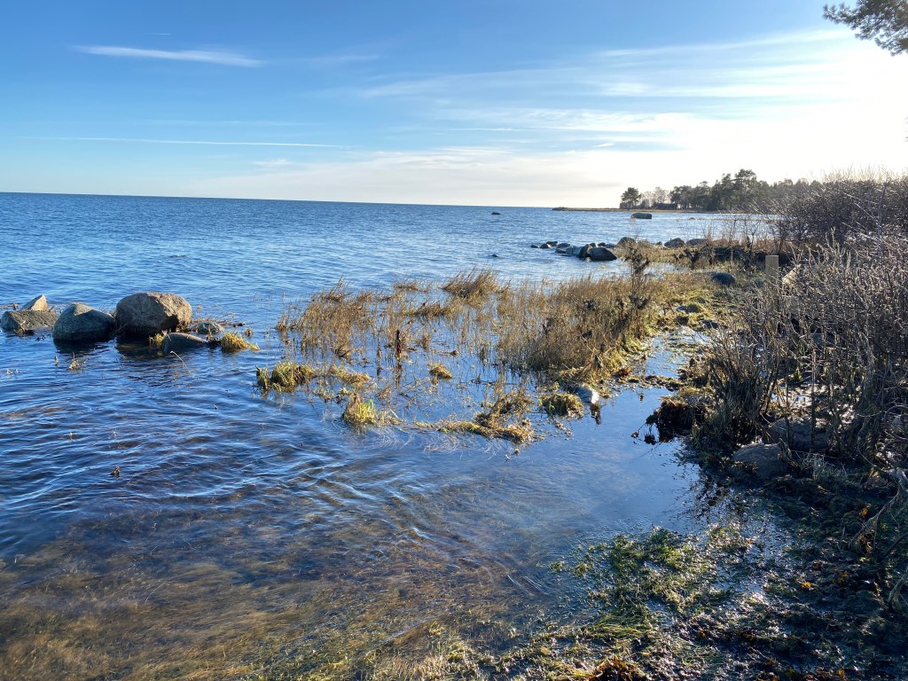 Han: Havet tar och havet ger, framför allt dumpar havet tång och ris. Ännu är det högvatten, men dagen efter Malek dragit bort återuppstår vår strandlinje. 85 centimeter steg havsnivån igår enligt SMHI, men i Bergkvara uppmättes +100 cm.