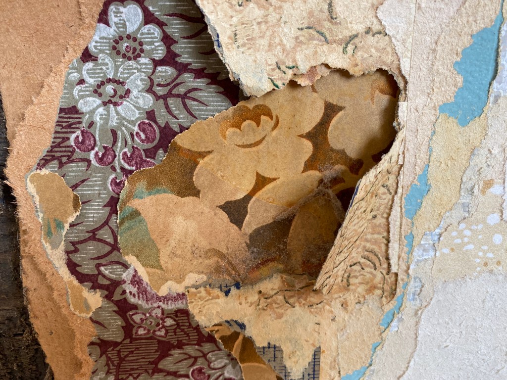 Och det kom dessutom fram ett åttonde lager tapet i torpet när han drog lite i ena änden av gårdagens dagsverke. Och vilken tapet sedan. Den är nog favoriten. Alltså den som har ett mjukt blommönster i beiget, brunt och lite turkost.