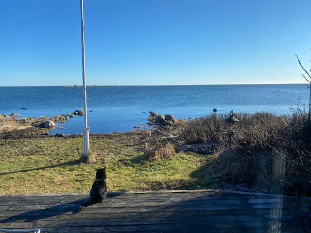 – Emellertid, havet hör vi dygnet runt och i morse (04:53) visste jag genast att vinden gått över från V till SV för bakdörren till lilla verandan med den gamla vinrankan inte längre rycker i sina gångjärn. ”Havet låter på ett särskilt sätt” sjunger Eva Dahlgren och så här nära havet låter dyningarna annorlunda mot den naturliga stenpiren än mot den dränkta sjöängen.
