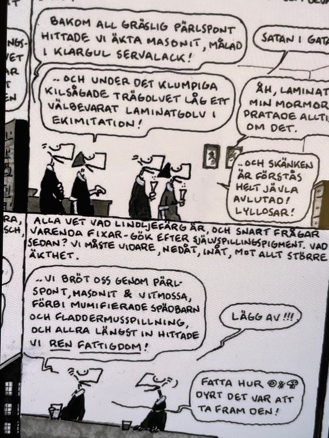 För egen del har jag fortsatt hennes arkeologiska studierna av gamla tapeter genom att frilägga hela den gamla timmerväggen i vardagsrummet.