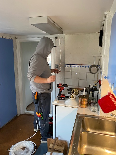 Han: Även idag har jag jobbat i torpet. Kasper från Satser har fixat lamporna i köket och korrigerat vissa dragningen efter hennes nya planering (tack för det alla ni som på Facebook stödde hennes möblering i sovrummet!)