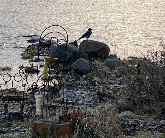 Han: Apropå hennes ornitologiska iakttagelser igår nöjer jag mig med att berätta om Kråkan. Ingen gillar kråkor men Kråkan är speciell. Beror förmodligen på att jag är blivit en sentimental gubbe. Hen bodde här på udden innan jag flyttade ner och en vinter fick jag begrava hens partner som låg död i snön.