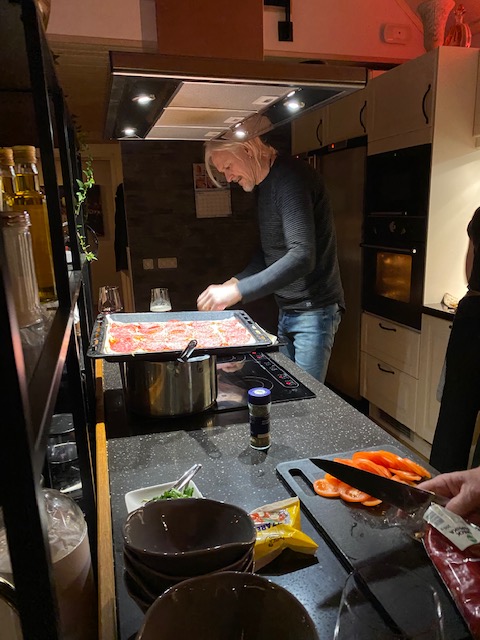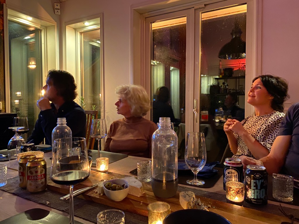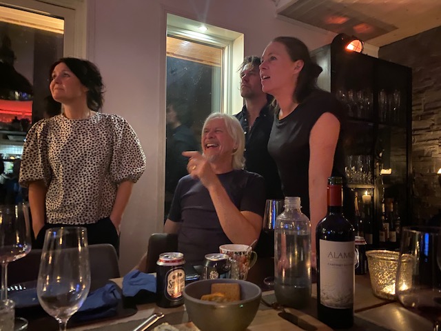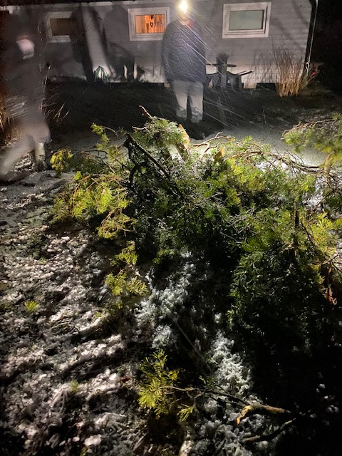 Han: Underbar kväll! Och sen kom Ben med sin taxi och räddade oss från att promenera hem i snöovädret och när vi trodde att den mardrömmen var över föll två tunga tallgrenar över vägen strax bakom bilen. Jonas i granngården hade hört braket, vilket vi inte gjorde i bilen och hjälpte oss röja så att Ben kunde ta sig hem till sin mamma i Torsås och där slutar ännu en omtumlande kväll på udden.