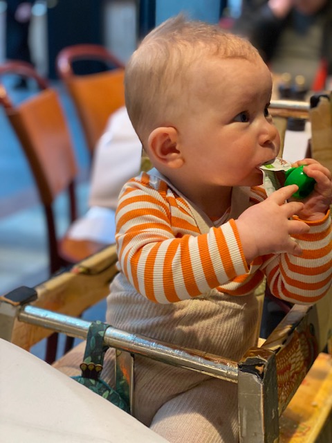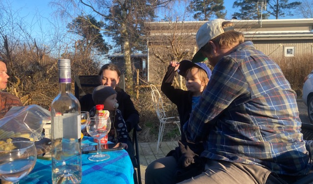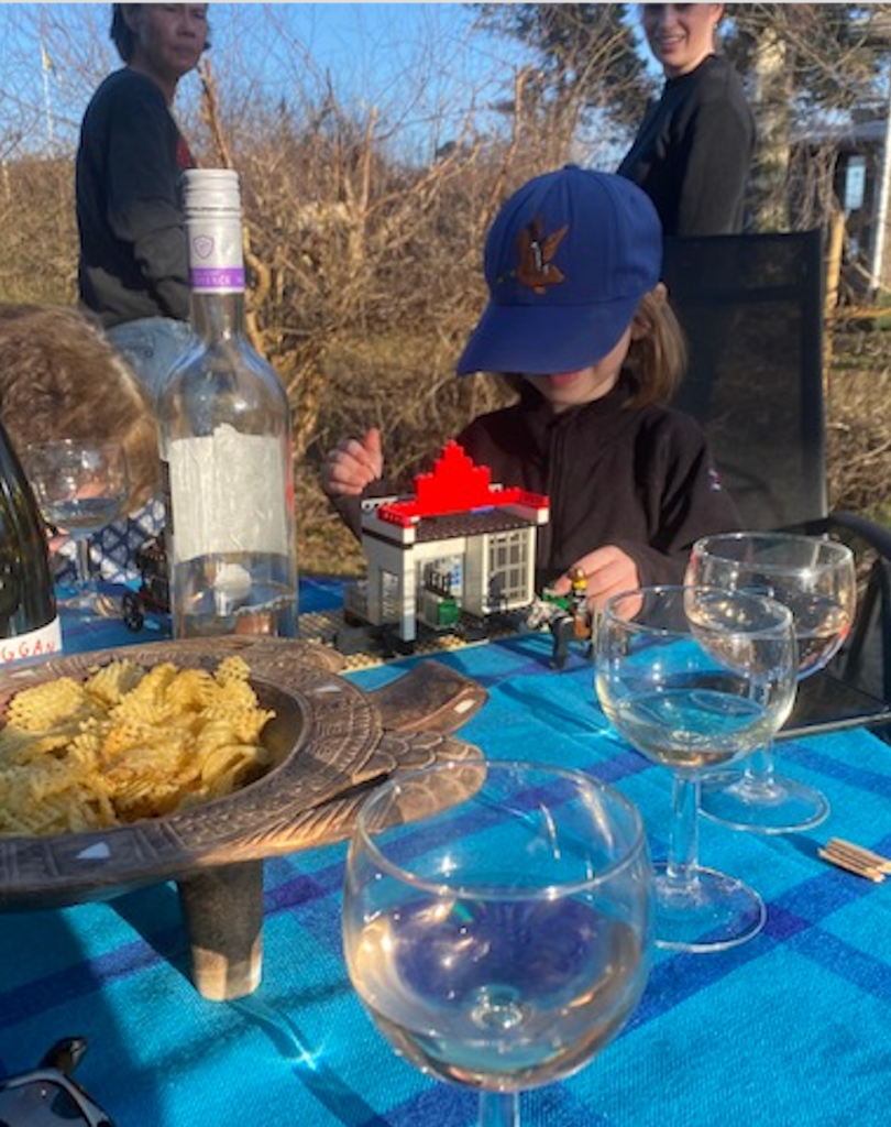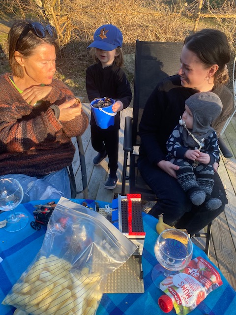 Han igen: Och sen kom Arthur över på en eftermiddagsdrink med sina föräldrar Jonas och Ingrid, lillasyster Rut och tant Kicki. Vi stod för vinet från Haggans, men Arthur kreerade tilltugget. Det visar sig att grabben inte bara ägde en bank i lego utan dessutom öppnat en krog med trendig namnet Potatis9 fast han bara är 4,5 år. – Tallkottarna var delicious, liksom desserten (ekologisk gratisglass, även den gjord på tallkottar) serverade i trendig blå hink som gick i färg med den blå duken.