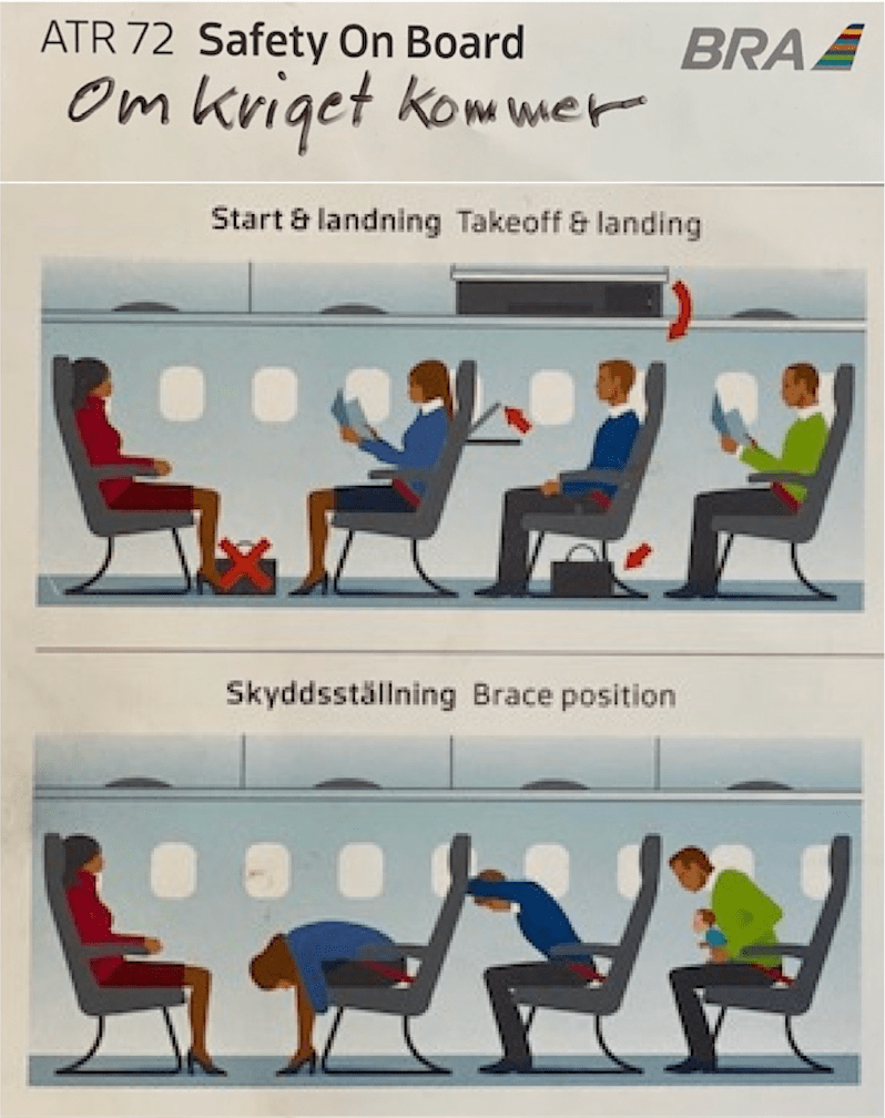 Men kriget finns där förstås. Även när jag flög till huvudstaden i veckan. Som vanligt slölyssnade jag på flygvärdinnas säkerhetsgenomgång. Kollar också in den plastinbakade instruktionen i stolsfickan. – Finns det nåt så bedrägligt som dessa könlösa teckningar vars syfte är att lugna oss, inte att rädda oss om planet skulle störta. Ungefär som hundratusentals svenskar efter den ryska invasionen tyr sig till boken ”Om Krisen eller Kriget kommer”. – Även det en snuttefilt som hjälper lika lite mot krigets fasor som BRA:s lugnande instruktion. Men som hjälper oss att upprätthålla de rutiner som håller verkligheten borta.