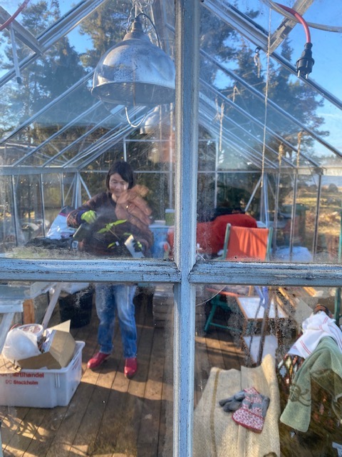 Idag kom nämligen Erik och Timmy från Nordpolen Energi för att montera våra solceller. Även de behövde lite arbetsledning och efter det blev även chefen själv inspirerad av andras arbete och satte igång med vårarbetet i växthuset.