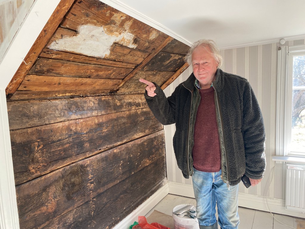 Och han är väldigt nöjd med matchningen till den blottlagda timmerväggen…