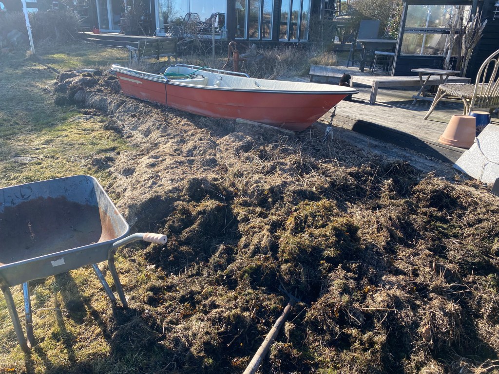 Men båten… vad gör vi med den? Ligger liksom fastkilad på en bädd av sjötång och gick och inte att bara knuffa ner som jag trodde. Och tror knappast vattnet kommer nå så högt upp igen så den tar med den tillbaka ner till strandkanten igen…