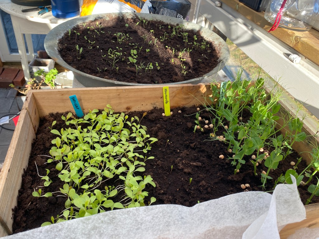 Men eftersom solen värmer upp så mycket på dagarna nu har både salladen och blommorna jag satt i vinter börjat titta upp. Kul!! Och bara jag får upp solcellerna på taket kan jag ju brassa på med mer värme och kanske flytta ut en del av plantorna inne också 🙂