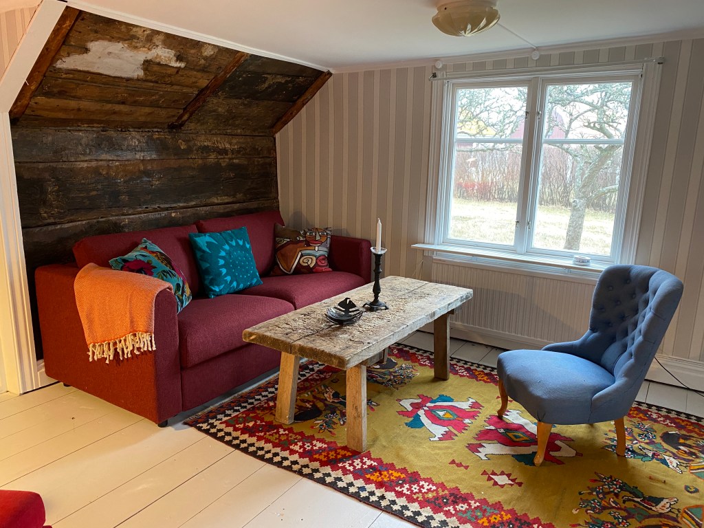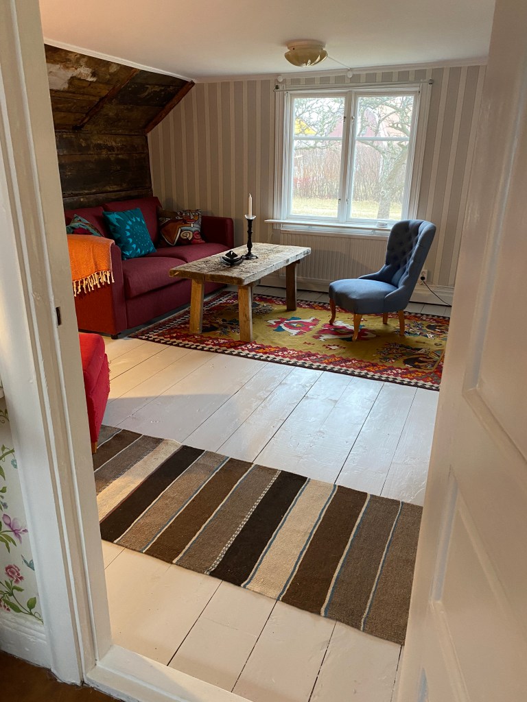 Sen till torpet för att klä soffan. Och piffade runt lite i sovrummet och i vardagsrummet. Men det saknas nåt kände vi. Eller jag … ny matta? Och så lampor och lite annat. Bara att åka till IKEA!