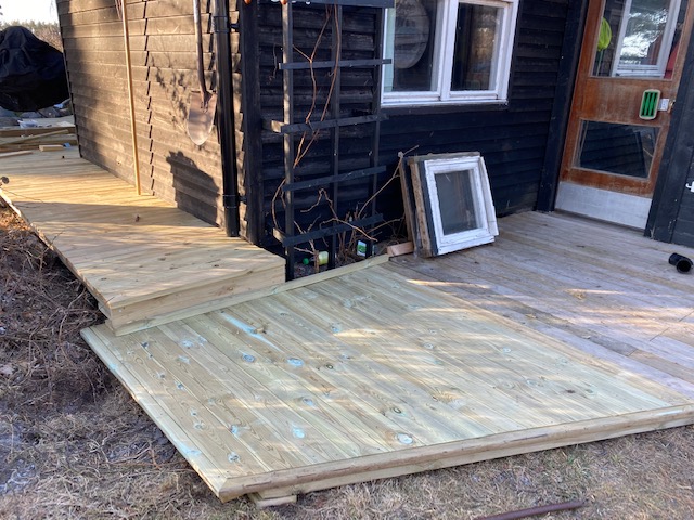 Om vi bortser från tre oplanerade resor till Lindbergs byggmarknad (visste du att en 28 x 45 trall a 4,2 m kostar 70 kr?) har jag ägnat sex timmar av återstoden av mitt liv åt att få till en övergång mellan den nya gången och altanen vid parkeringen.