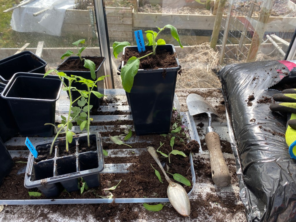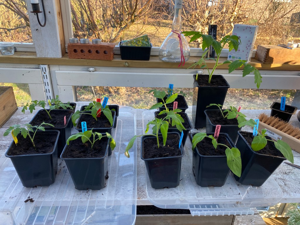 Hur jag lyckats klämma in mer plantor inne vet i sjutton, men idag chansar jag och placerar även en del i växthus 2. Får väl slösa på elen och ha fläkten på i natt även om det inte går under nollan. Inne är det knökfullt!!