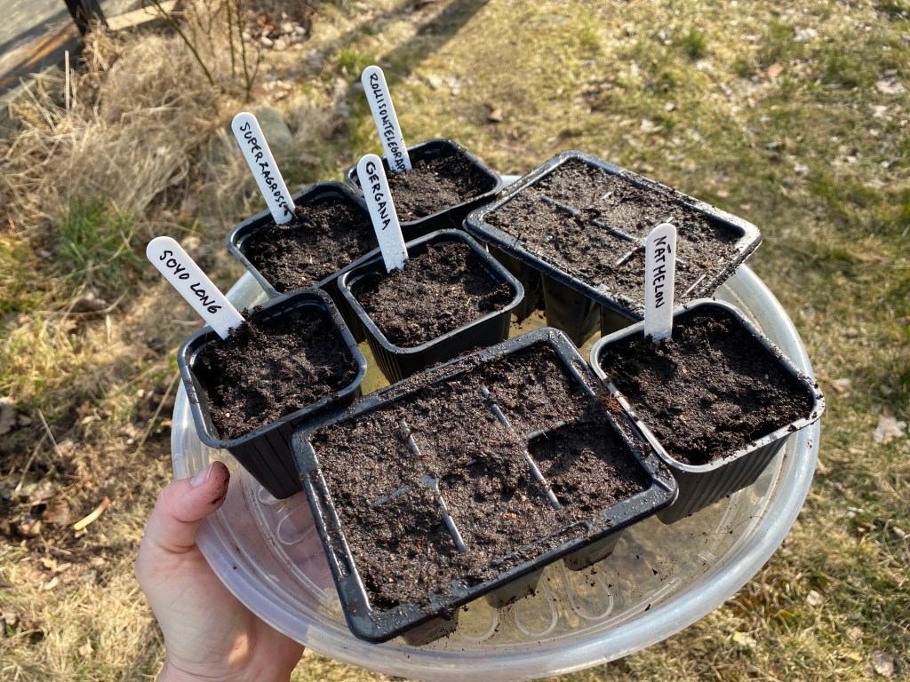 Satt lite gurkfröer idag också, alldeles för tidigt egentligen, men kunde inte låta bli. (Likadant varje år…). Satte dock bara ett frö av vardera, så inte säkert så många kommer upp. Och tur i oturen vore väl det, för innan de kan flytta ut på friland har de väl tagit över här inne. Växer jättefort!