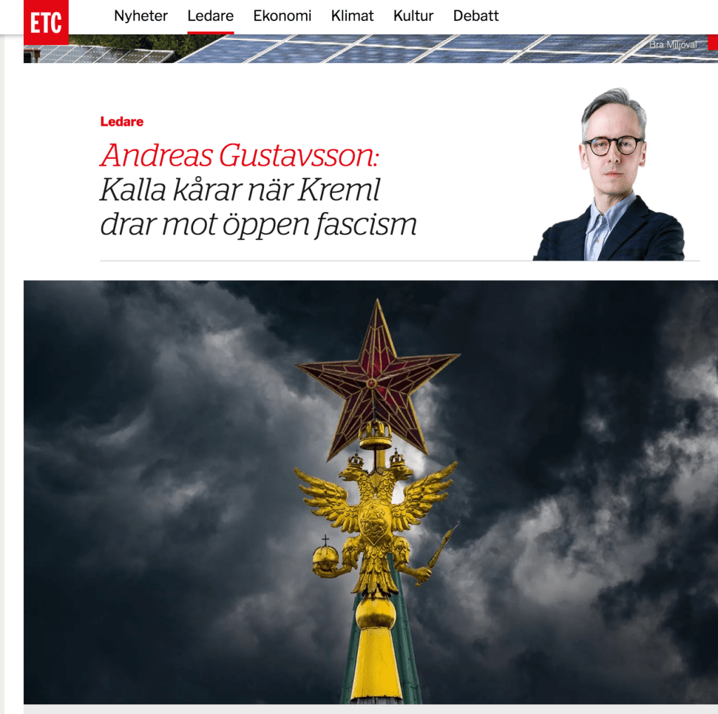 Nu är vi på väg igen och vi känner igen lössen på gången. Idag avgick liberalernas partiledare, möjligen som en effekt av ett pinsamt avslöjande i tidningen Dagens ETC. Men den stora nyheten idag är inte det utan att samma vänstertidning uppmärksammar hur obehagligt fantasilöst Putins propagandister kopierat Hitlers propaganda för att motivera angreppskriget på Ukraina.