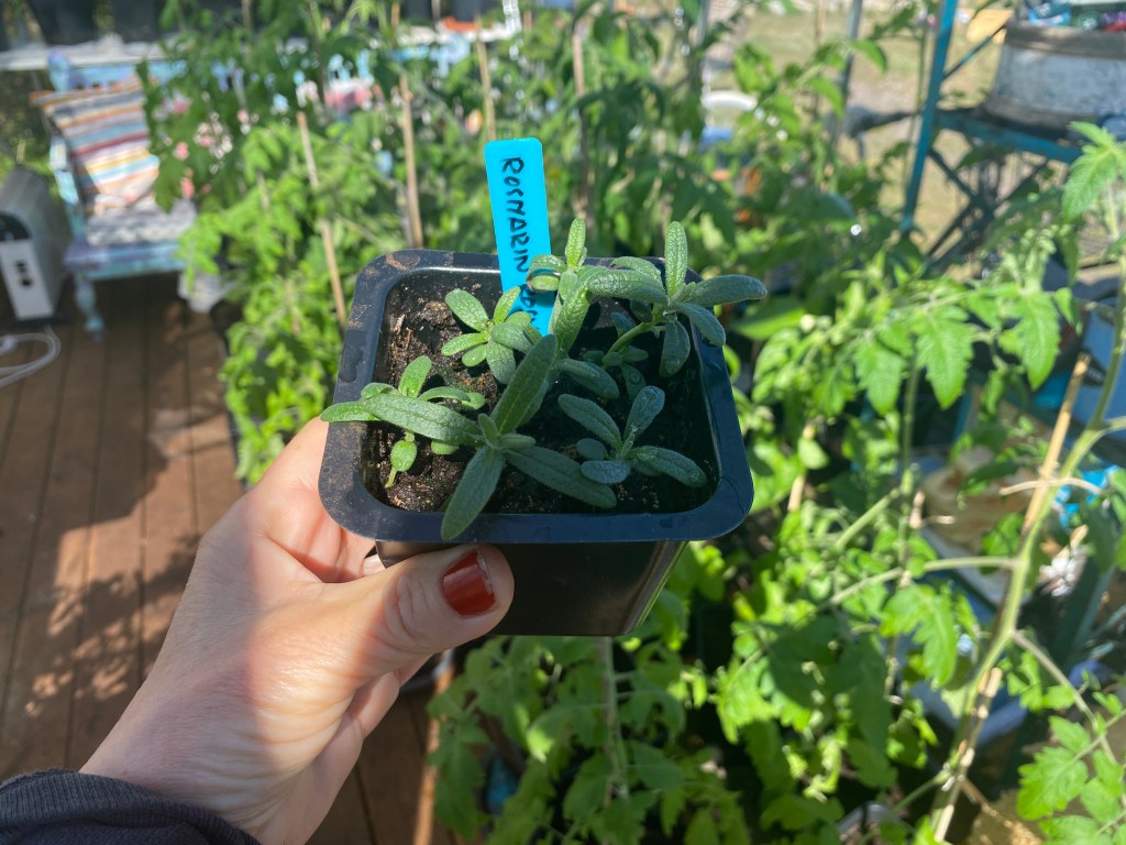 Fick några rosmarinfröer av en kompis för några veckor sedan. Aldrig satt det förut, bara köpt plantor och satt ut. Men de har kommit upp fint. Åtta stycken små plantor. Dags att skola om till varsin kruka.