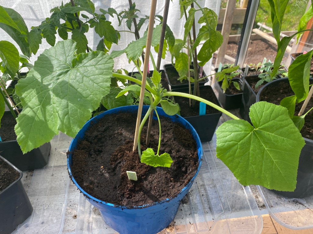 Så därför fick den enda som överlevt (vattnade ihjäl några…) ny kruka, med lilla krukan kvar för att skydda stjälken från vatten (botten bortklippt), flytta ut i växthus 1. Hoppas natten blir varm…