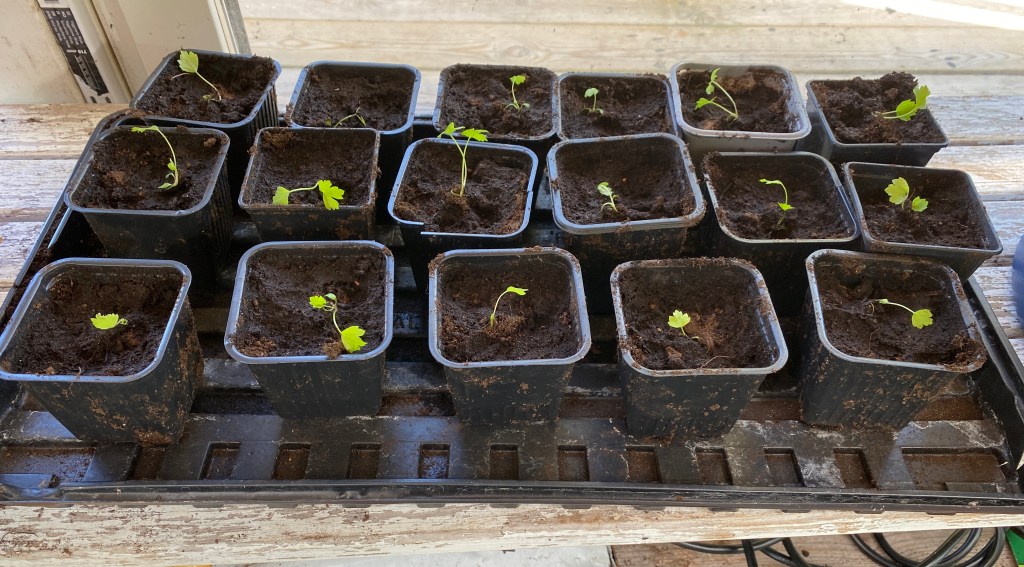 Hon: firar att jag tog tag i rotsellerin som växte i samma lilla plastask och behövde säras på och få egna små krukor. Ett jäkla pilljobb, nästan värre än löken. Ca 40 stycken har fått egna hem, hoppas de överlevde separationen… min rygg gjorde det, nog…