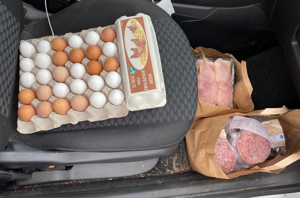 Kanske blev det lite mycket ägg… ett flak primörägg (trodde de skulle vara pyttesmå) plus tolv stora. Blir mycket omelett!!! Och så hamburgare på angus från Smaklöken, köttfärs, 2.5 kg kalvlägg (blir det Ossobuco av), 12 stora kycklingklubbor mm mm. Vi klarar oss ett tag!
