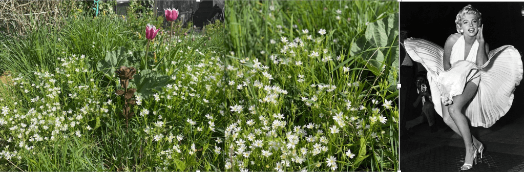 – Utom då den anspråkslösa, trofasta och alltid lika vitklädda grässtjärnblomman, Stellaria graminea som aldrig stått på någons VIP-lista men som den här tiden varje år tar över utomhusscenen.