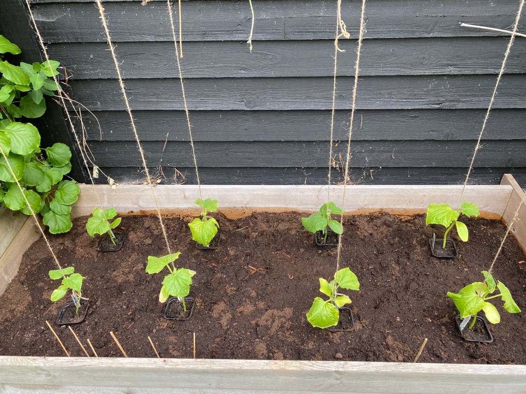Hon: äntligen vågade jag plantera ut gurkorna (tidigt innan han vaknade). De har haft sina små planteringskrukor ända tills nu och behövde verkligen få mer jord att breda ut sig i. De liksom reste på sig direkt. Squashen också!