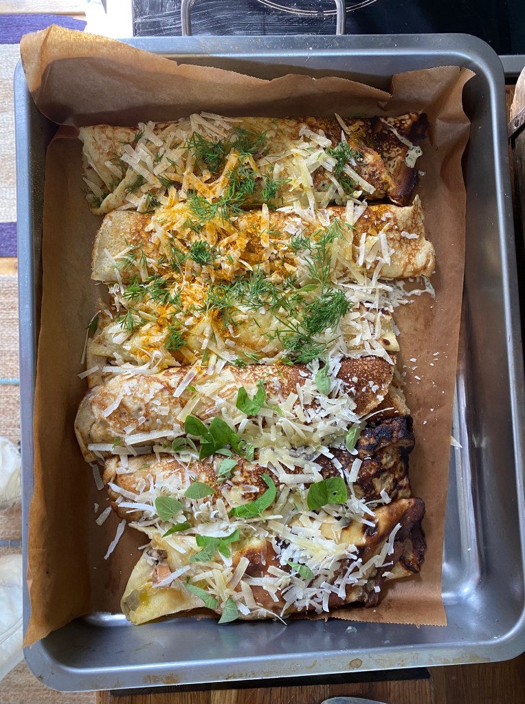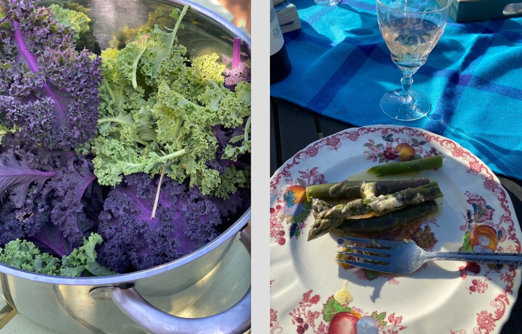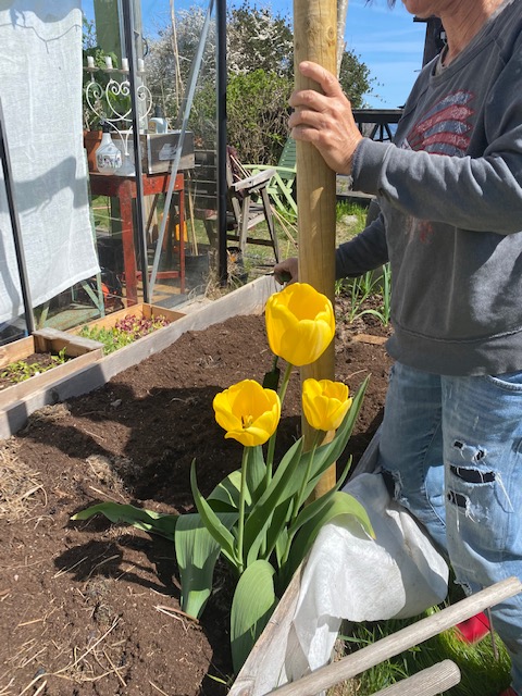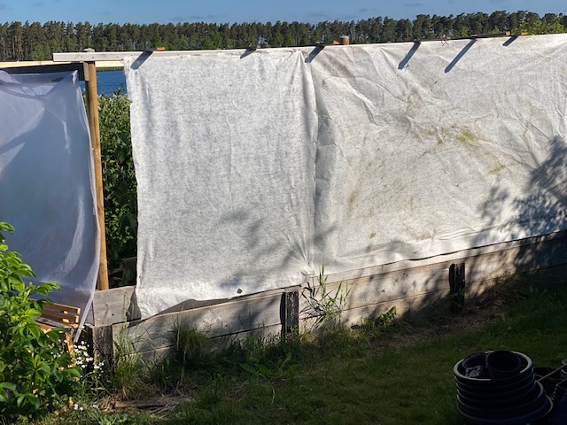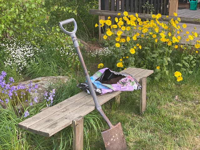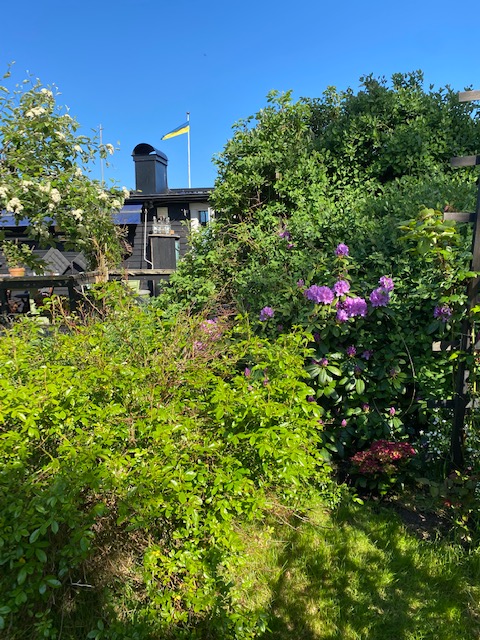 Hon: stanna upp, och stanna upp … hinner jag inte, massor att göra idag. Plantera om, plantera ut, ta bort ogräs som skulle tagits bort för längesedan mm mm. Och nu kokar jag rabarbersirap av en del av de fina rabarberna jag fick av Lise i förrgår. Tror det är årets fluga faktiskt, läst om det både här och där.