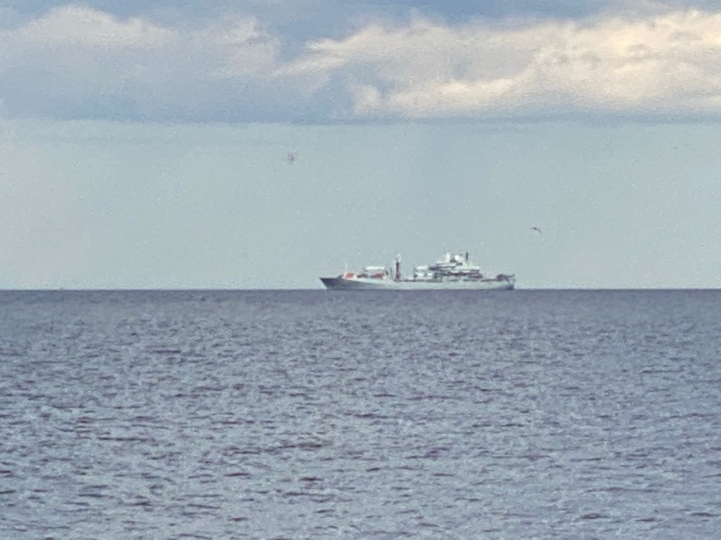 PS. Och när jag nu lyfter blicken från mobilen ser jag att ett annat fartyg ankrat upp, och har dessutom fören norrut. Borde de inte vara på väg söderut… och hur kommer det sig att de ligger just här. Och så nära land! Nu påpekar han att det är en helikopter på fartyget också …