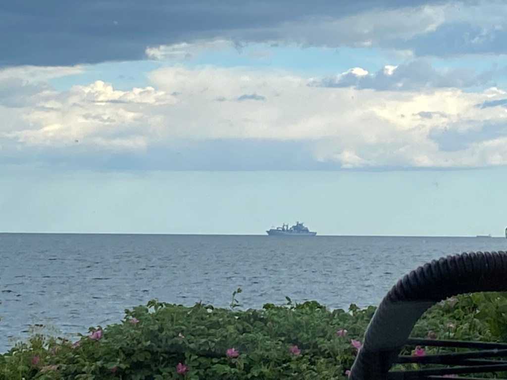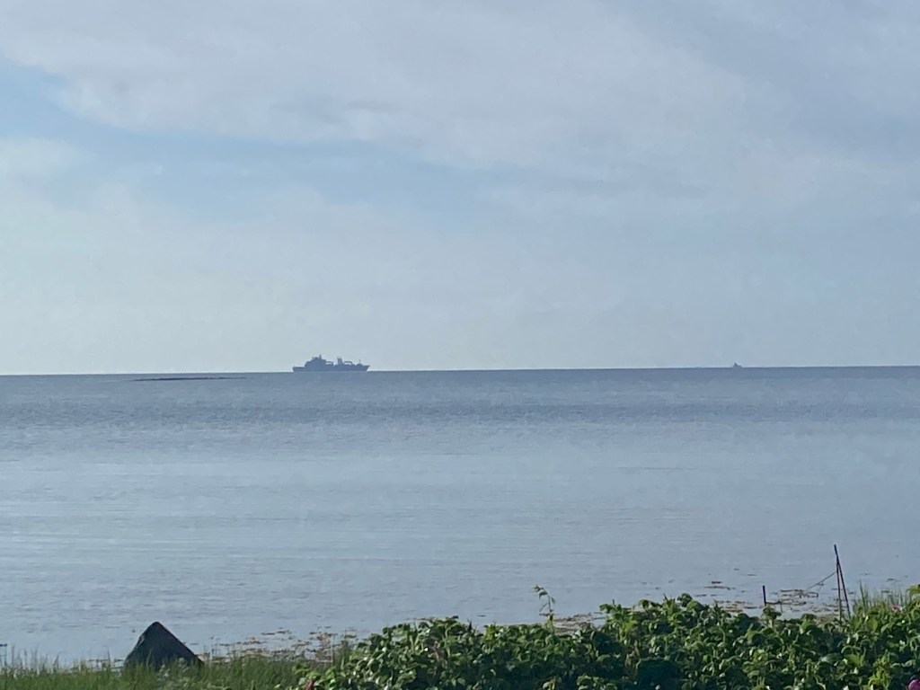 Hon: apropå vår vy så glömde jag lägga upp denna bilden i förrgår, då låg nämligen NATOs krigsfartyg för ankar här utanför över natten. Ett stort och två små. Det stora såg ut som ett exklusivt kryssningsfartyg när det var upptänt på natten. Enligt vår lokala underrättelsetjänst var det ett tyskt fartyg som varit i Stockholm på övning och nu var på väg till Kiel. Men besättningen var nog inte intresserade av vår blåstång…