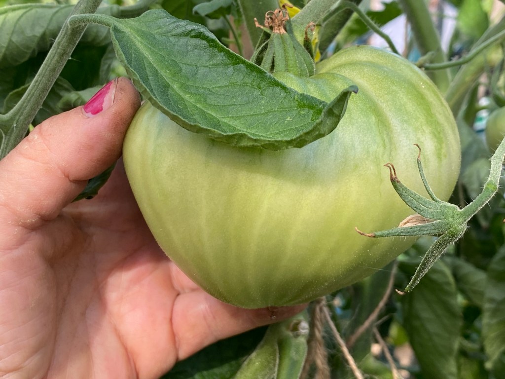 Dagens största tomat; ja av någon anledning är årets tomater i kruka finast. De jag satte ut först på friland blir det bara små förkrympta på. Som tur är har jag ett land till där jag lyckats få upp en fin Mai Wei-planta. Tyvärr har jag alldeles för få plantor av den absoluta favorit-körsbärstomaten i år. Hur tänkte jag där…