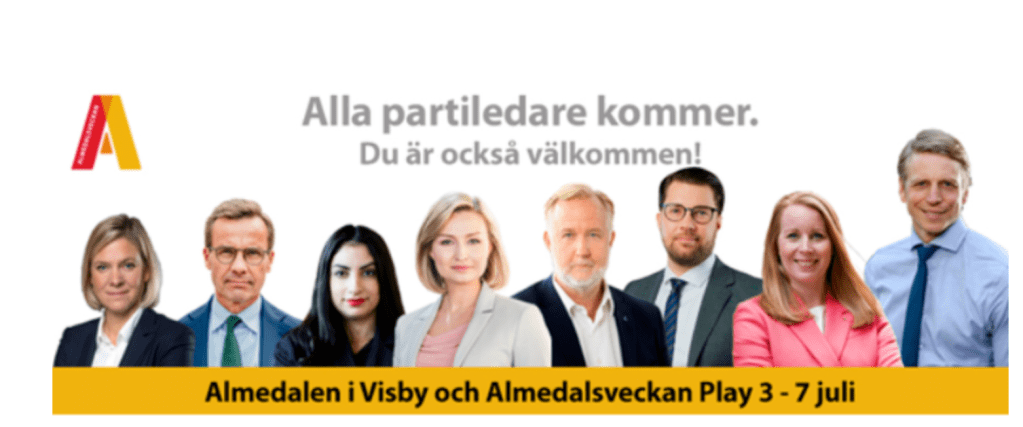 Vad det betyder? Svar: ”Kortare vecka, ökat fokus på politik och ett fullspäckat program. Närmare 100 000 besökare beräknas delta på plats i Visby under Almedalsveckans fem dagar. Till detta kan läggas mer än 500 timmars livesändning av evenemang på Almedalsveckan Play. Så kan årets Almedalsvecka sammanfattas.”