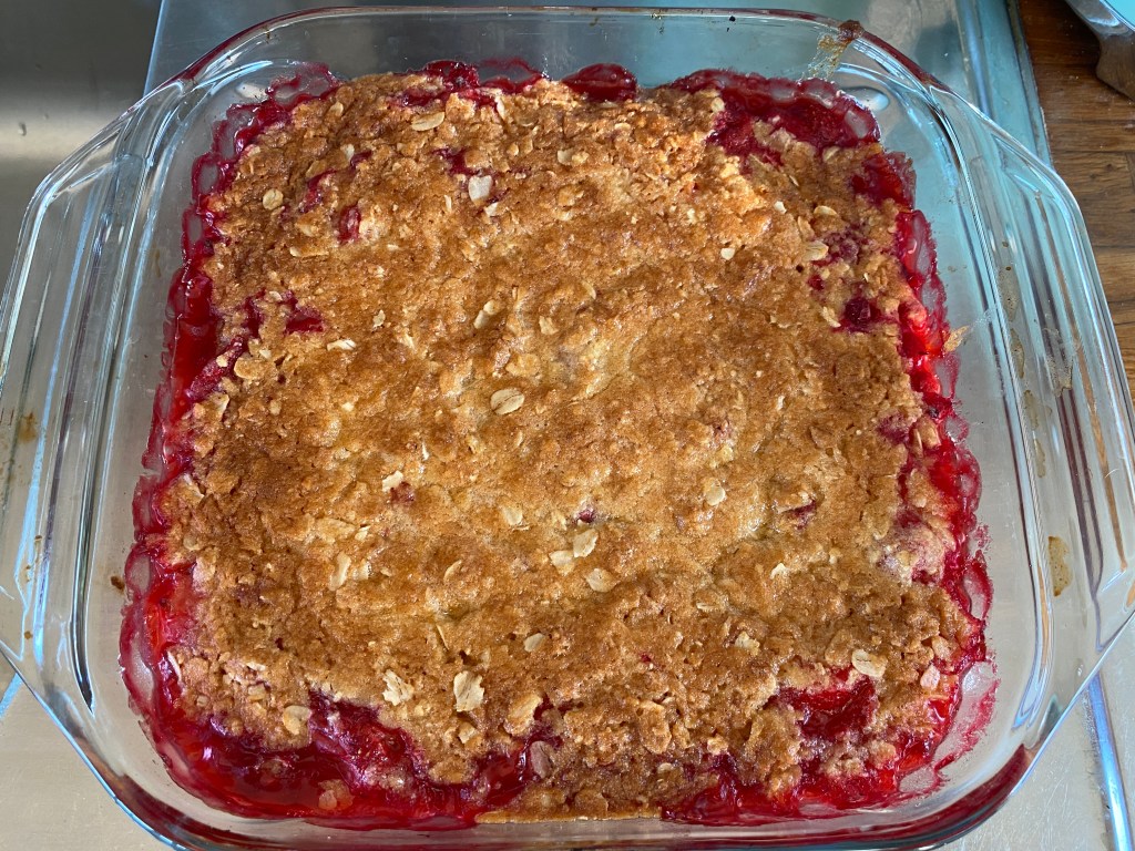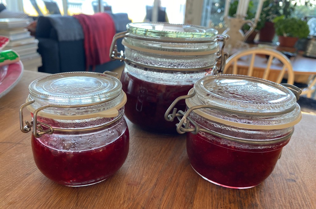 Efter att gått igenom planteringarna (som bästaste Ancy skött till perfektion) och vattnat ytterligare en gång (det blåser hård vind som torkar ut) plockade jag av så många röda vinbär jag orkade. Rensade dem och gjorde en paj och marmelad. Lite jordgubbar slank också med. Helt klart en arbetsdag!