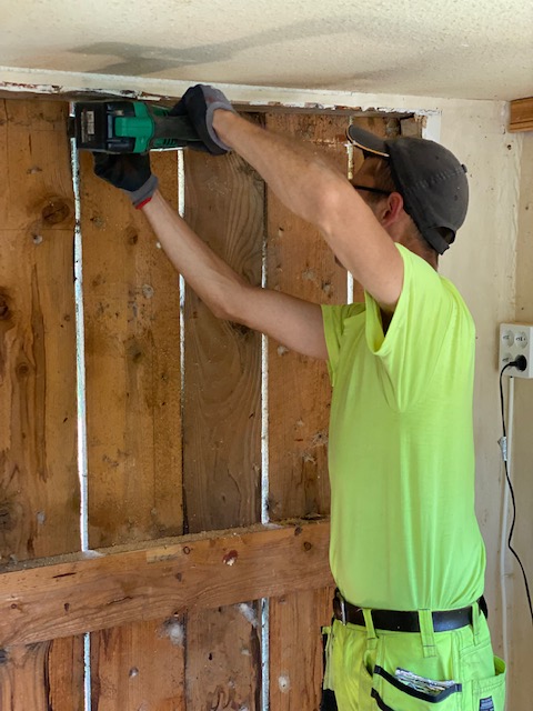 Dagen började med att jag hade en vägg. Och eftersom ingenting är enkelt började grabbarna med att förstärka balken i taket på ladan.