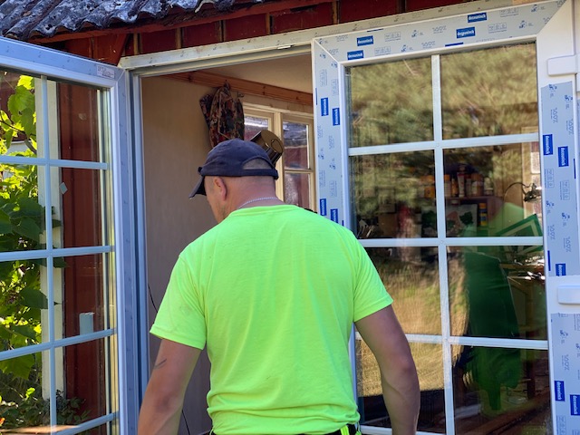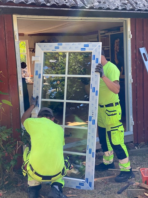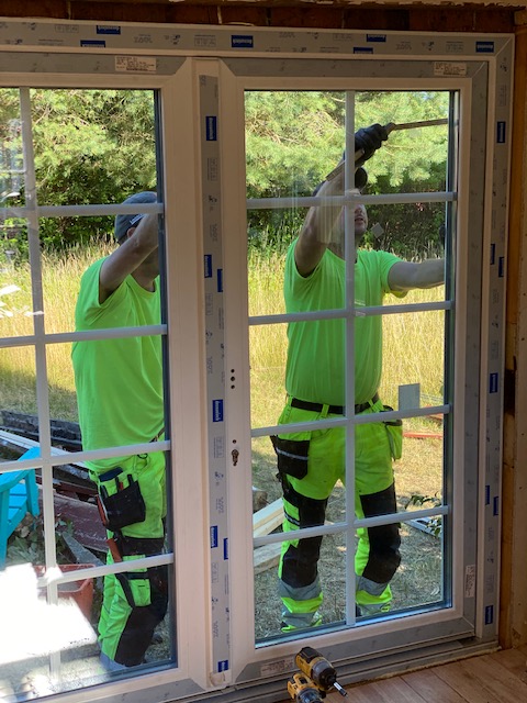 Tillbaka i verkligheten: Jag vet att det är lördag och alla vettiga människor är lediga. Men säg det till Tomek och Krzysztof, för äntligen har våra verandadörrar kommit till ateljén (”Leverensproblem” är det nya svarat).