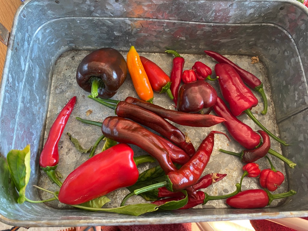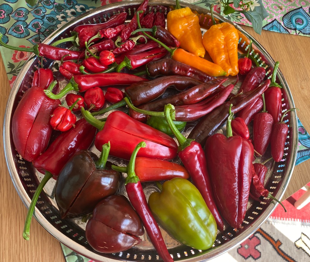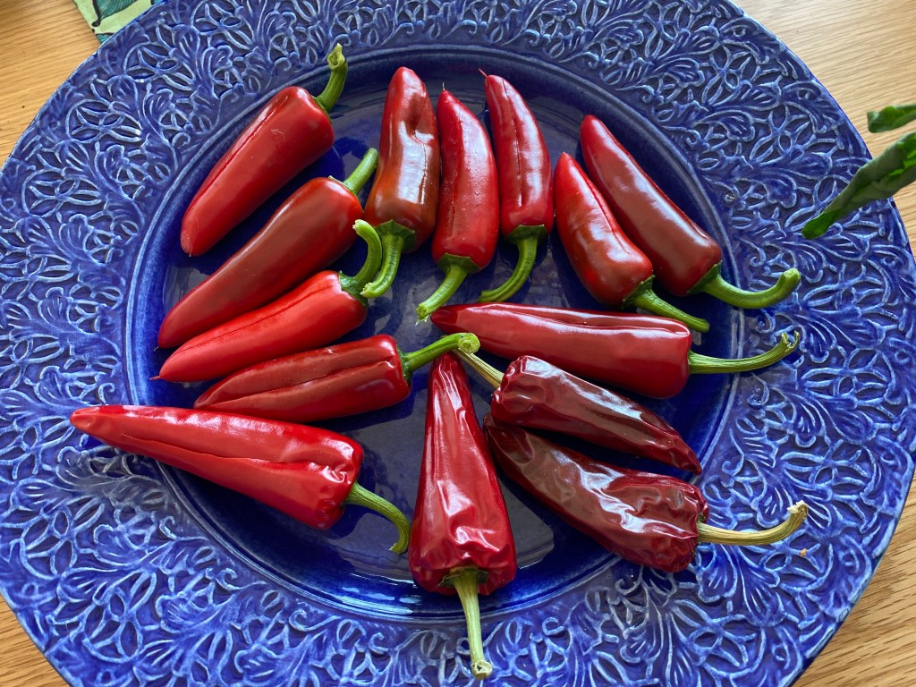 Även chilin, som jag inte riktigt hunnit med i år, behöver också börja skördas och torkas för att bli kryddor. Än så länge torkar de bra i solen på köksbordet, det är inte så många mogna än, men snart får det bli en snabbare process i ugnen.