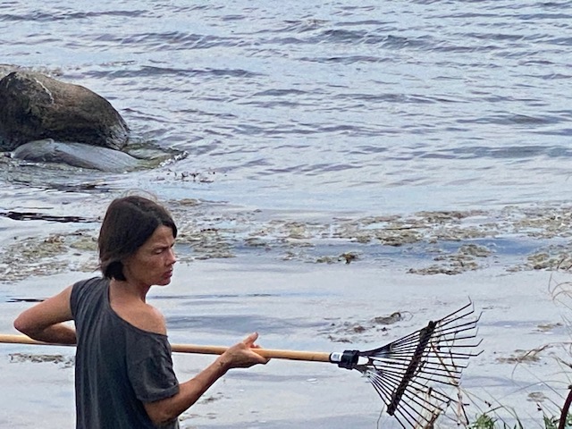Hon: strån… ett ton sjötång som fastnat i vassen är nu lösgjord och ligger som en tung massa i alla badvikar härnere. Kommer bli ännu dyigare än innan. Varför inte ta upp vassen i oktober när höststormarna tar med resterna av massakern ut till havs om det nu måste göras? Inte mitt i badsäsongen. Och konstigt att inte Skeppevik växte igen förr om åren innan någon hade en tanke på att ta bort den utom just där man badade kanske…