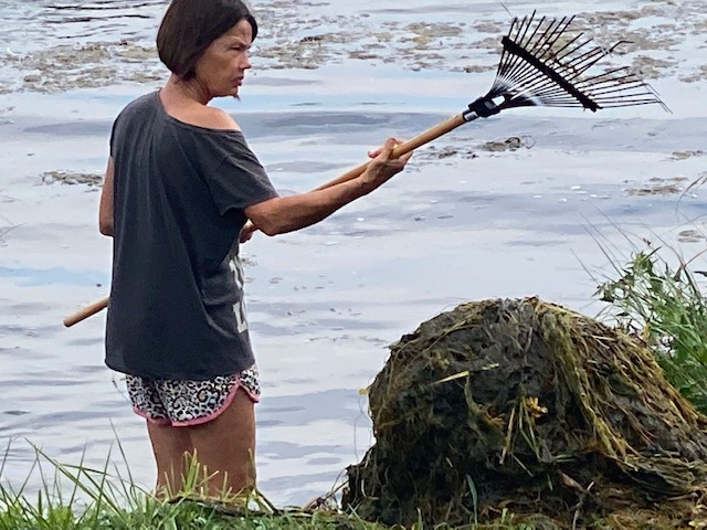 Hon gillar det verkligen inte eftersom lite vass flyter in i hennes vik.