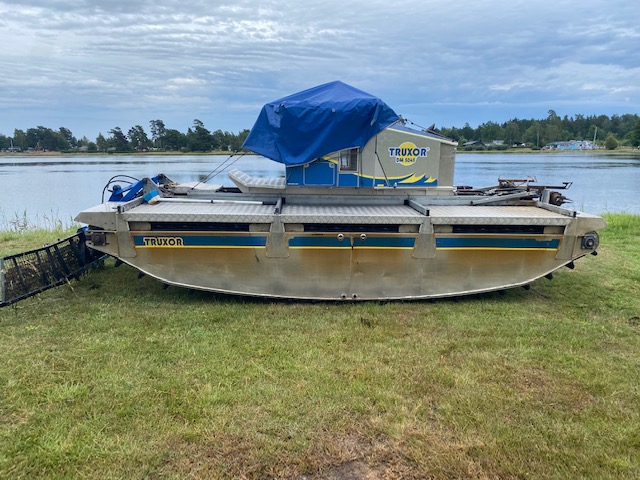 Och här kommer Tommys truxor in. Det är en slags flytande amfiebandvagn med en rejäl gräsklippare och syftet är att få bort så mycket näring som möjligt från vattnet slås vassen över ytan. ”Slås vassen över ytan leder det till att vassbeståndet kan fortsätta att växa och suga upp näring ur sediment och vatten. Den bästa tiden att slå vassen för att få maximal effekt är då vassen blommar (juli-augusti) och mycket näring finns bunden i vassplantorna. Det är viktigt att den skördade vassen tas upp på land så att inte näringsämnena som finns i vassen läcker tillbaka till vattnet.