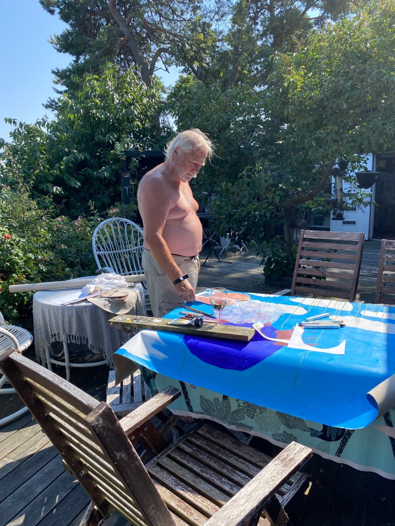 Men nu är det alltså full fart på udden. Semestern är definitivt slut! Han målar på en beställning, jag skördar för fullt och förädlar. Plus en massa annat som måste göras efter en veckas semester. Baka, plocka av mogna björnbär (ska bli sylt) försöka få igång surdegen igen (gick sådär i första baket…), packa upp och tvätta. Med mera, med mera!