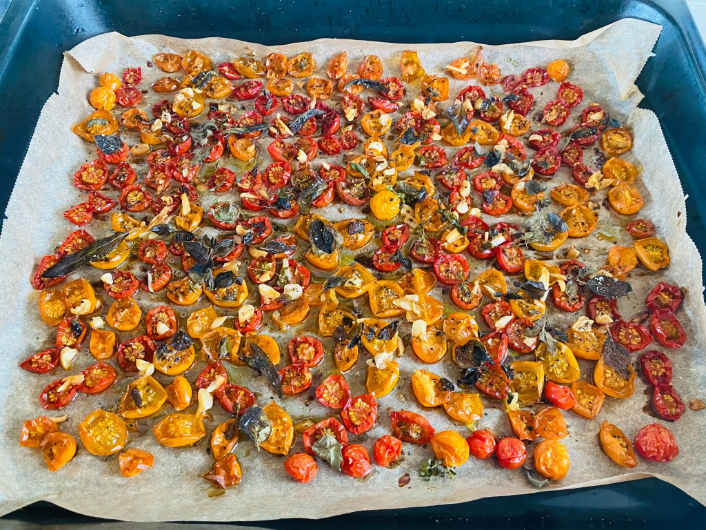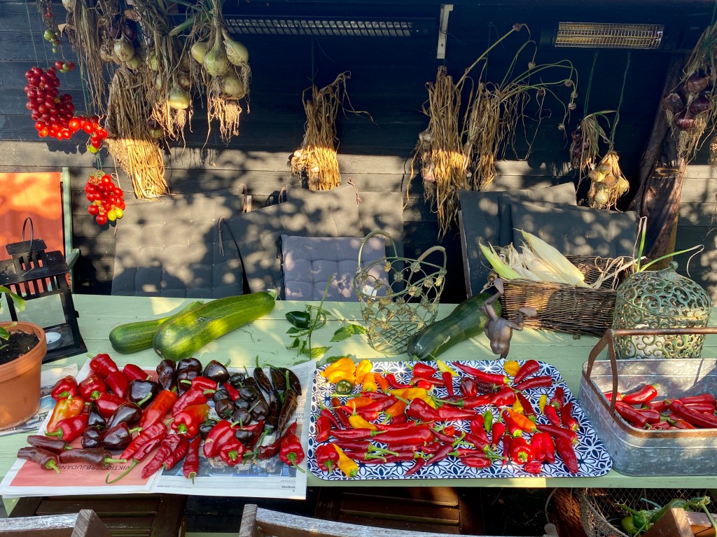 Inte hunnit börja med ketchupen än, vilket är lite stressande eftersom tomaterna är på sluttampen, men chilin som mognat är i alla fall på ”tork”. Just nu i solen, eftersom ugnen är upptagen av ugnsbakade tomater: