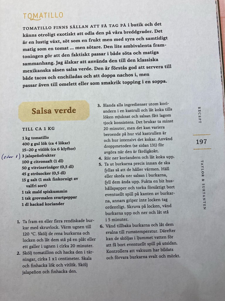 Bland annat har jag kokat en Salsa Verde på de tomatillos som mognat. Receptet fick jag av Lise, min gamla böstis från lågstadiet. Hon fick två tomatillo-plantor av mig i början av sommaren och hade testat det här receptet av Taylor & Surtanten: