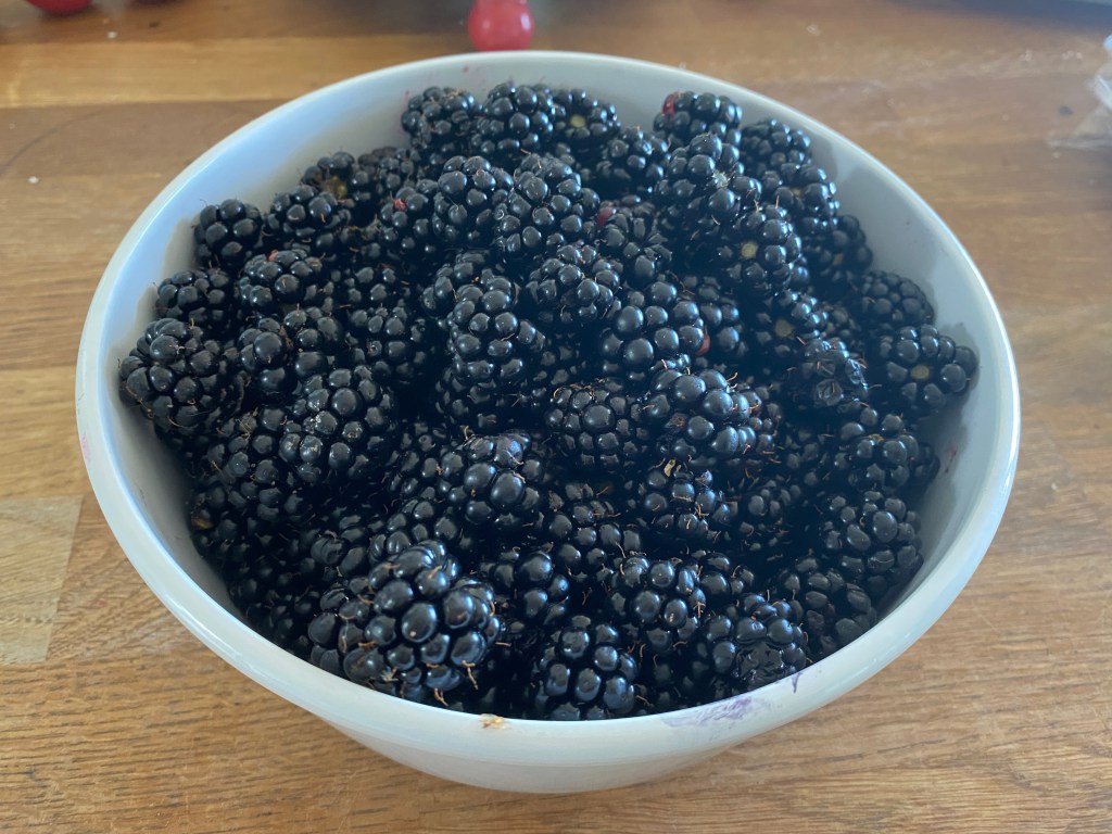 Plockade också av ett par liter björnbär utanför hus 1 och hus 2 på udden, det är mycket bär i år. Men inte så lätta att nå, aj!! Blir paj i vinter! Skjuts in i frysen. Björnbärsmarmelad har jag redan gjort. Det här med självhushållning har blivit en sport.